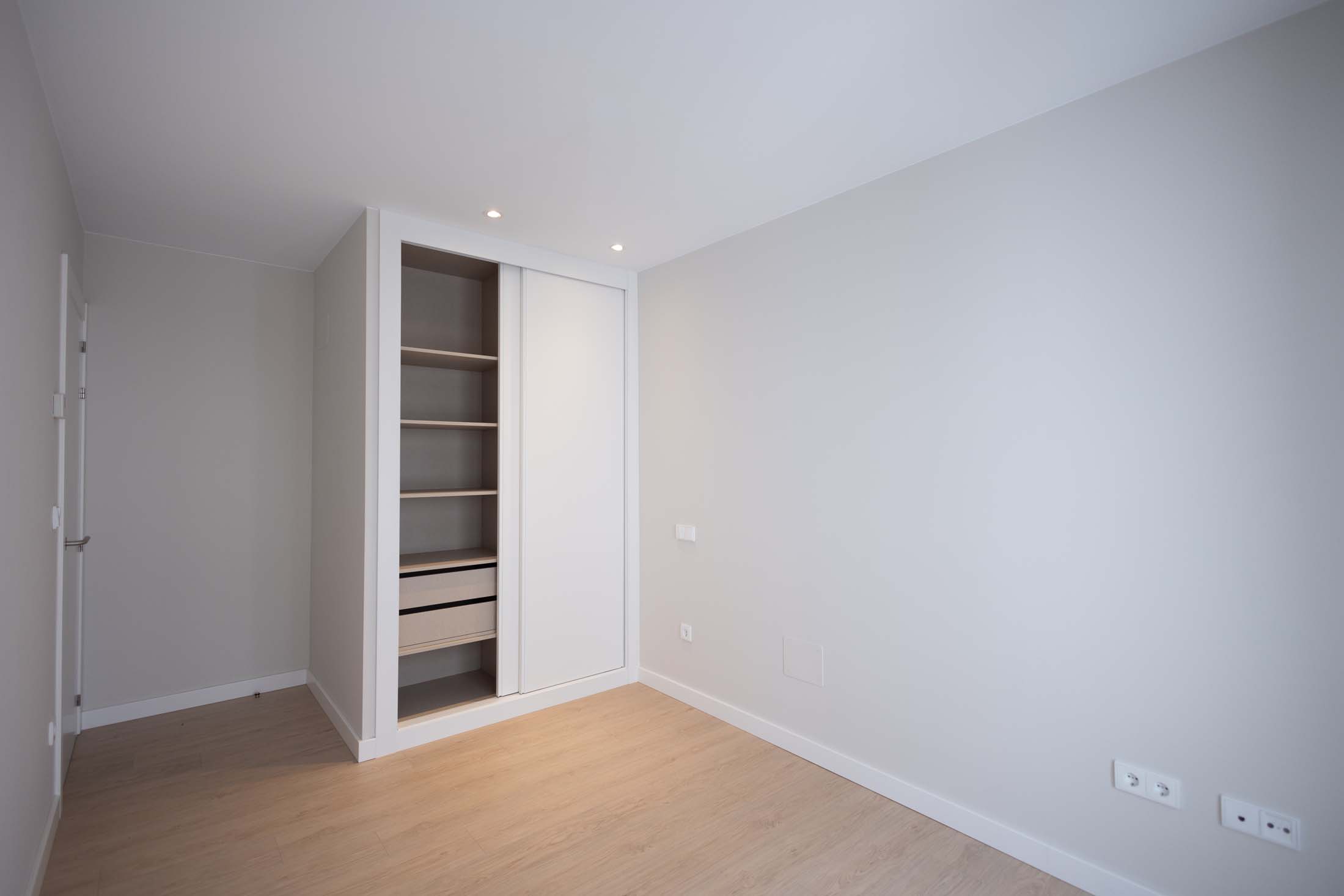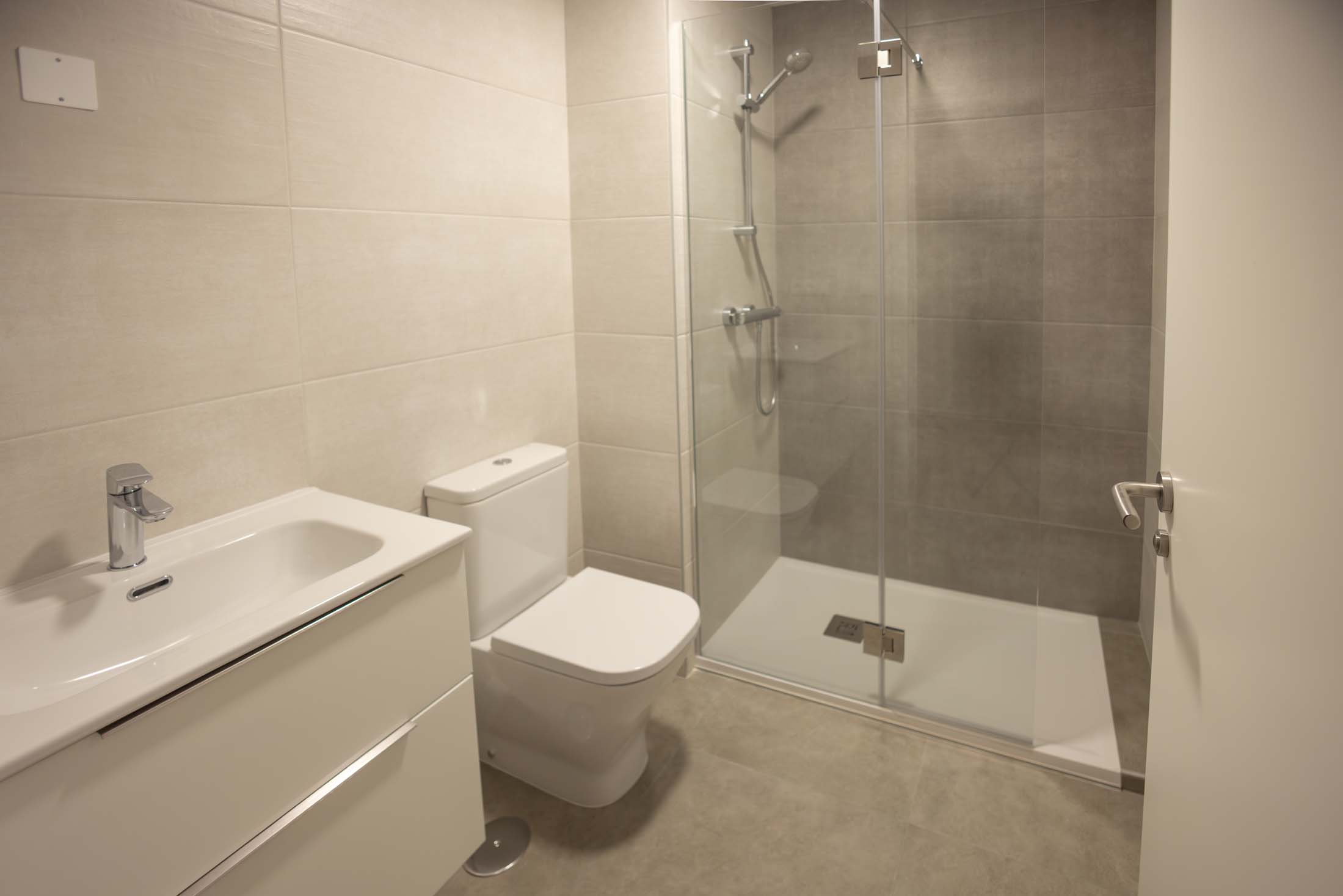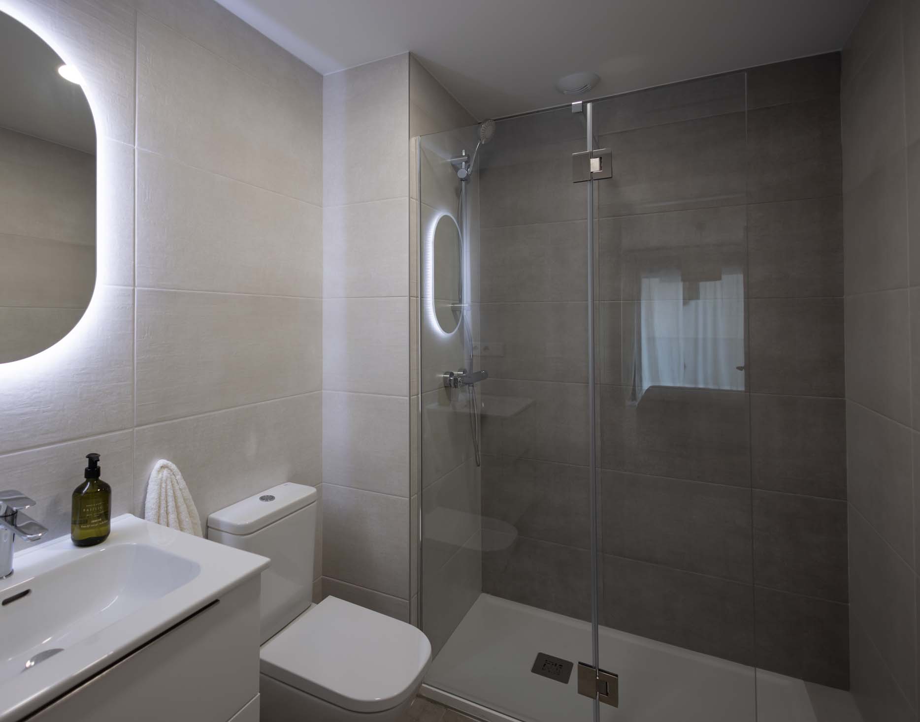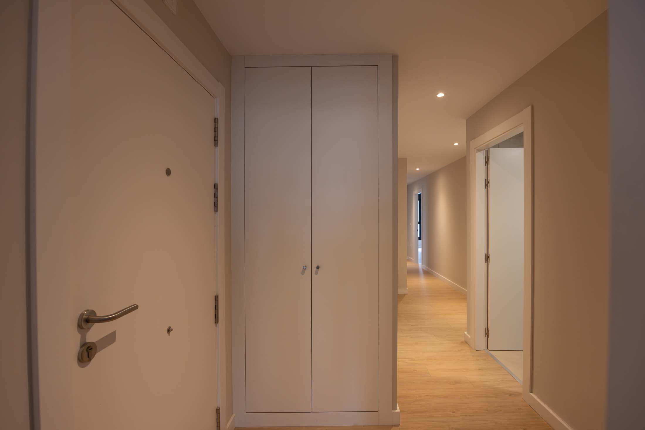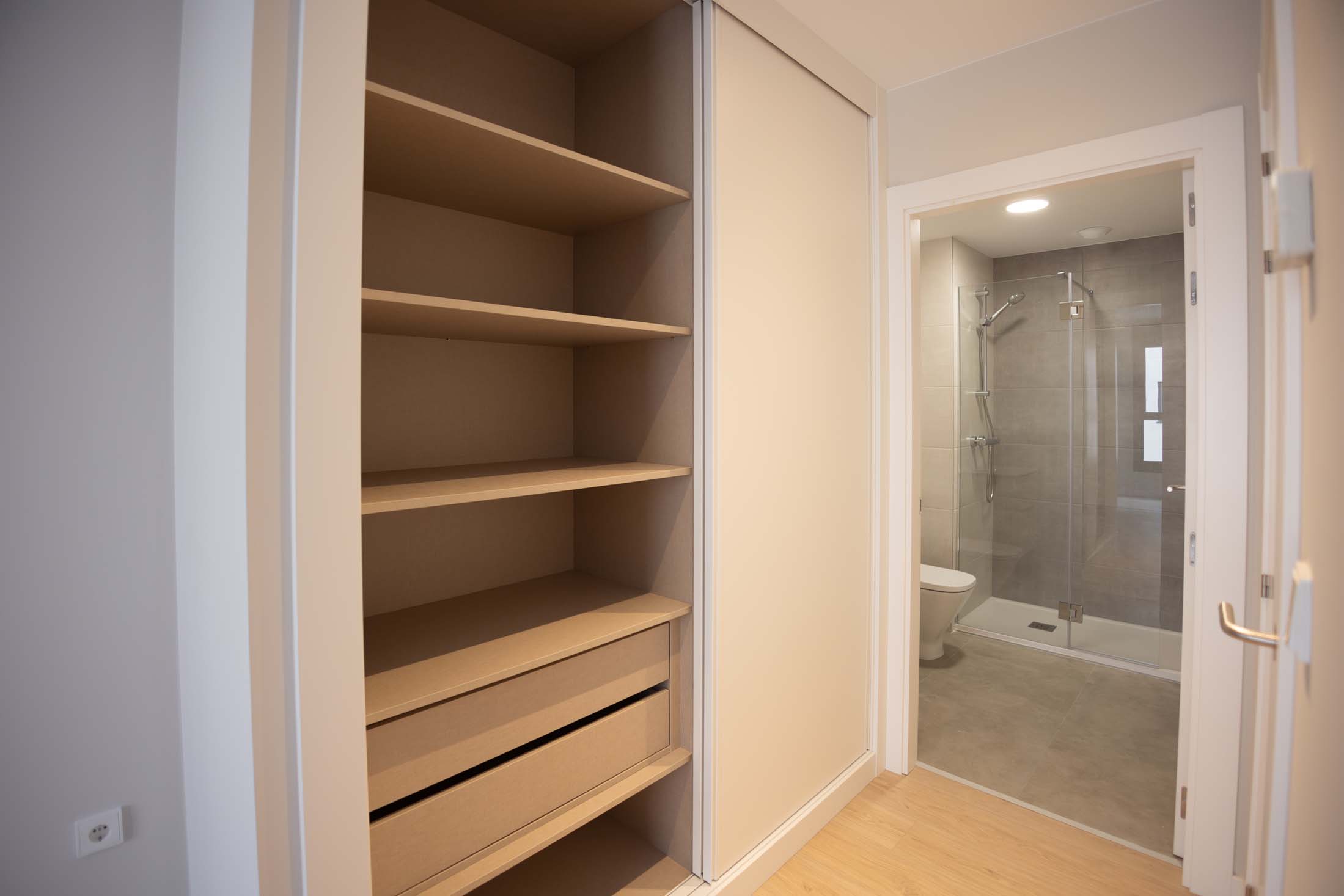 Las viviendas cuentan con: cocinas equipadas con electrodomésticos de la marca BOSCH, baños con mueble de lavabo y mamparas, armarios empotrados divididos interiormente en dormitorios y entrada de la vivienda, carpintería interior en color blanco, pavimentos de gres en baños, lavandería y cocina y suelo laminado en salón–comedor y dormitorios. La instalación de producción de agua caliente y calefacción será del tipo individual a base de caldera de gas natural estancas y de condensación. El edificio contará con una instalación de aerotermia, para la contribución solar a la producción de agua caliente sanitaria en las viviendas. Las viviendas disponen de un sistema de calefacción por suelo radiante.